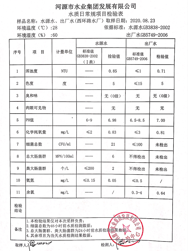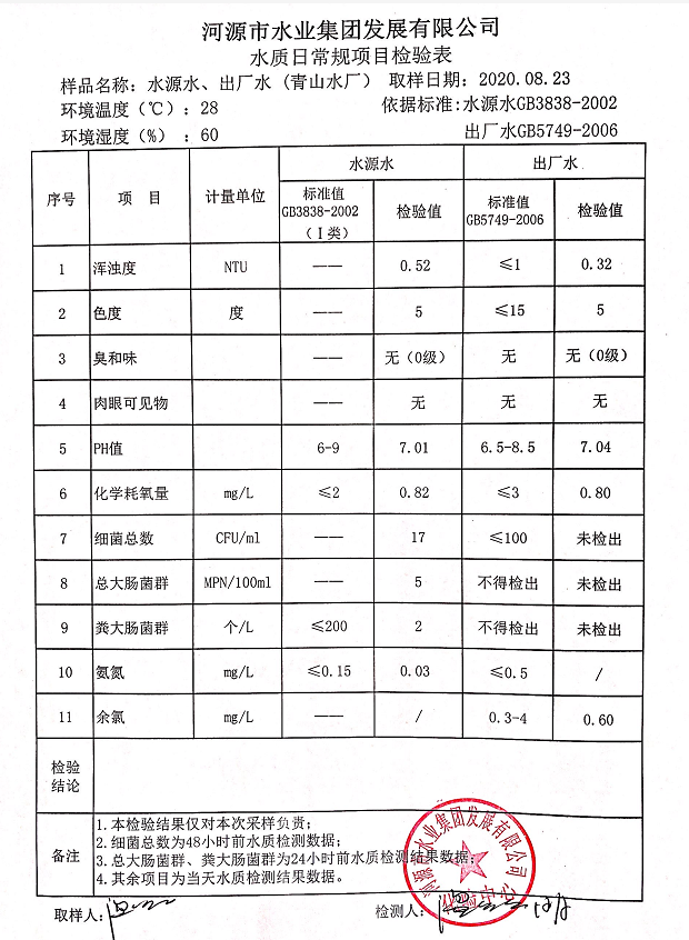 2020年8月23日水質(zhì)檢驗(yàn)報告