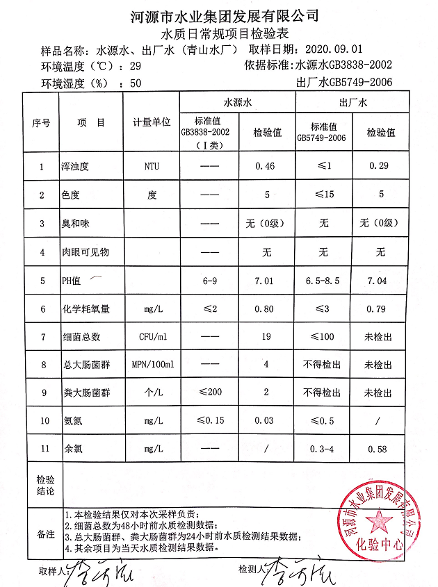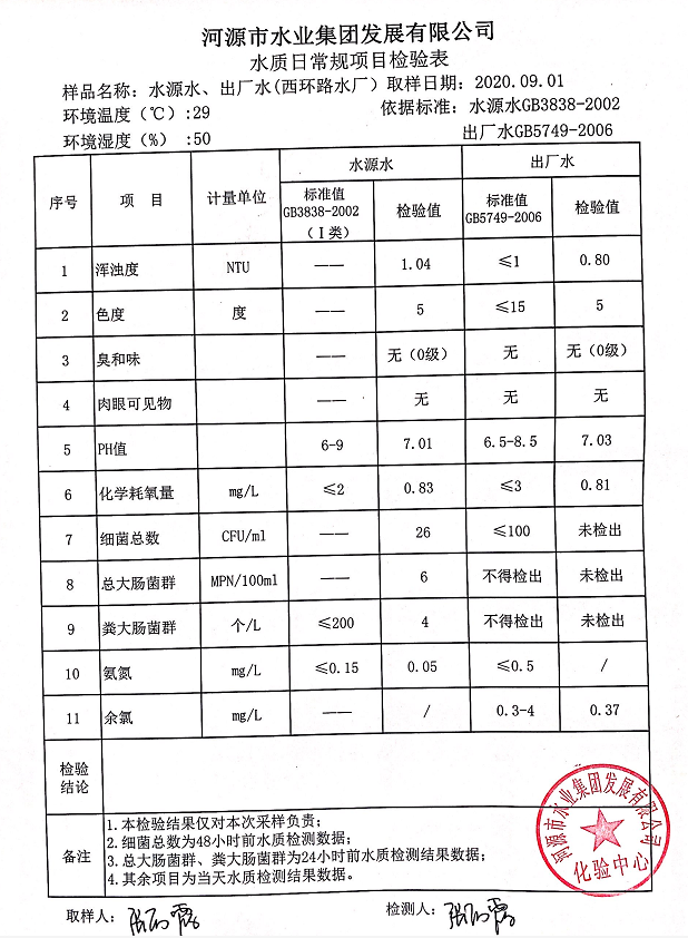 2020年9月1日水質(zhì)檢驗(yàn)報告