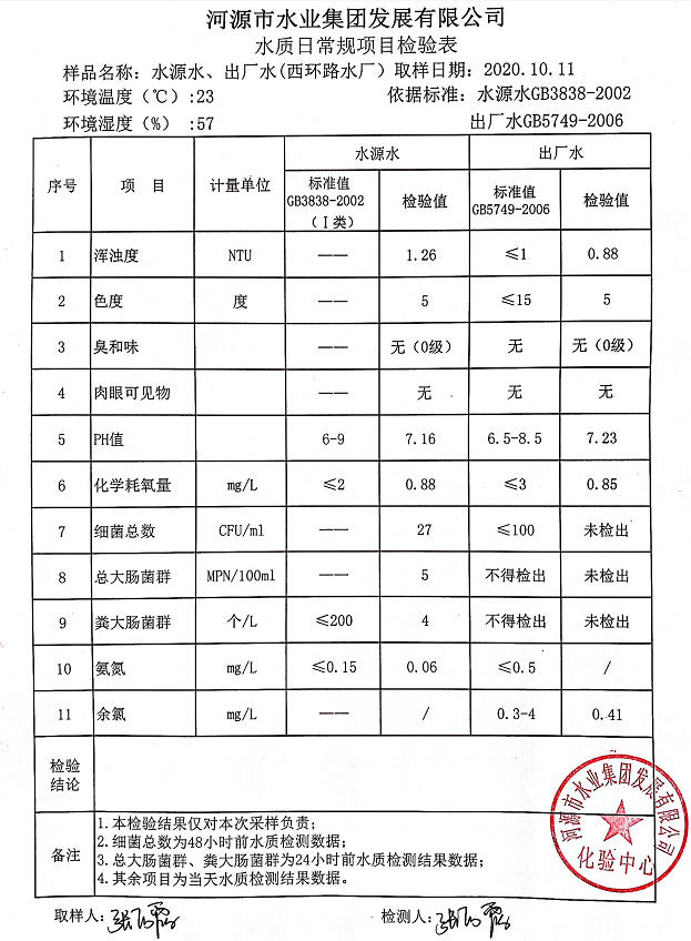 2020年10月11日水質(zhì)檢驗(yàn)報(bào)告