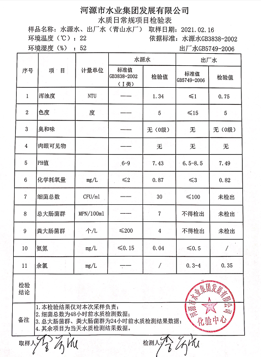 2021年2月16日水質(zhì)檢驗(yàn)報告