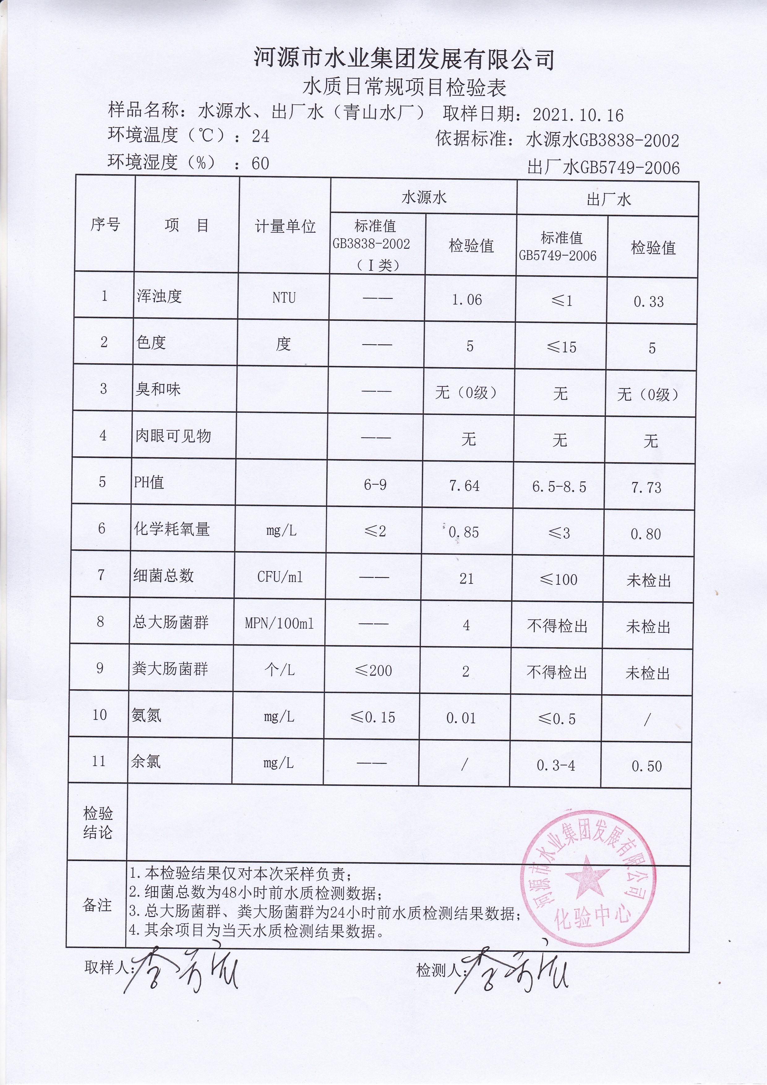 2021年10月16日水質(zhì)檢驗(yàn)報(bào)告
