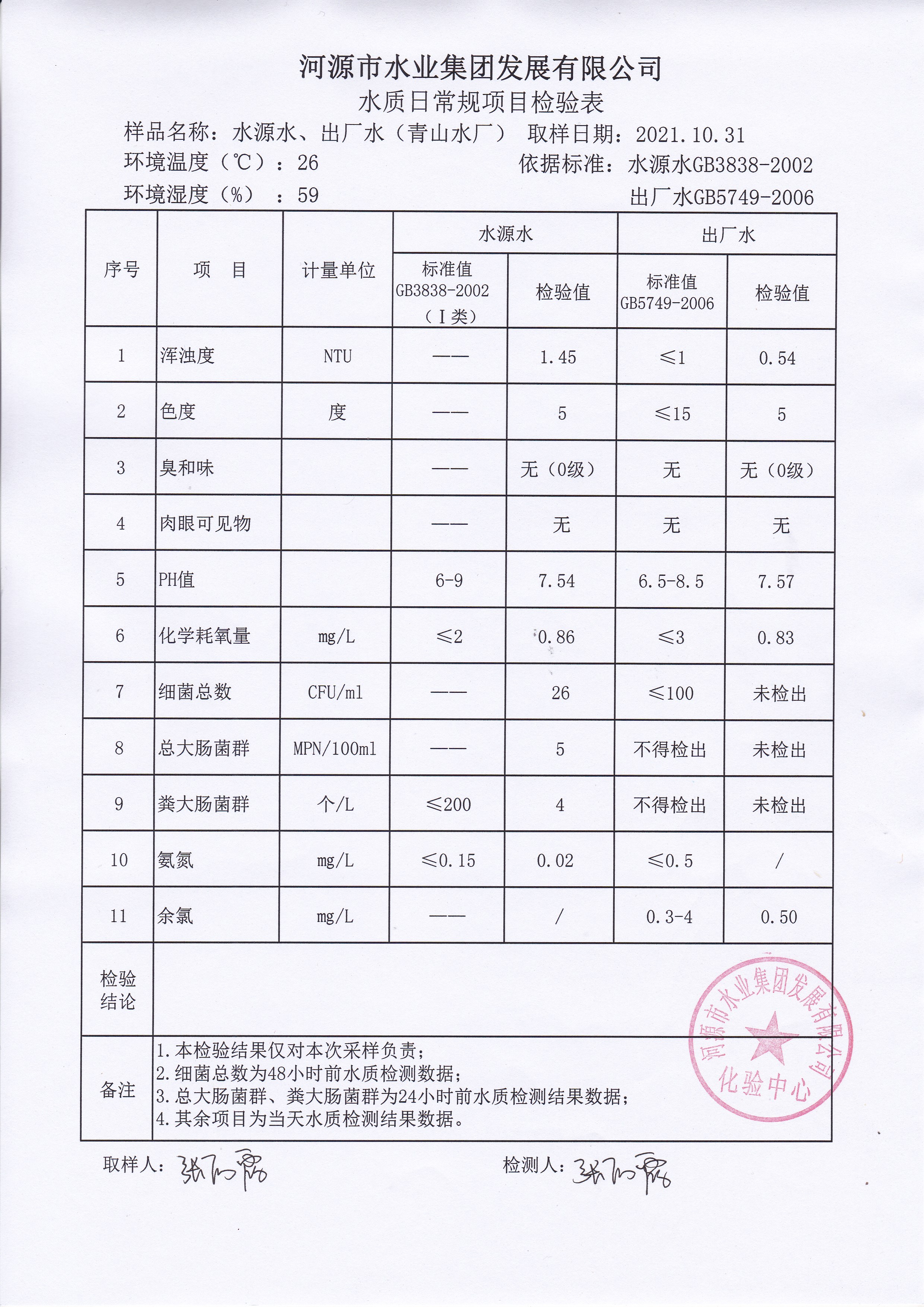2021年10月31日水質(zhì)檢驗報告