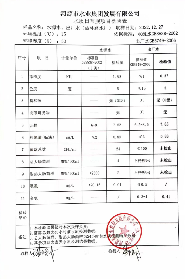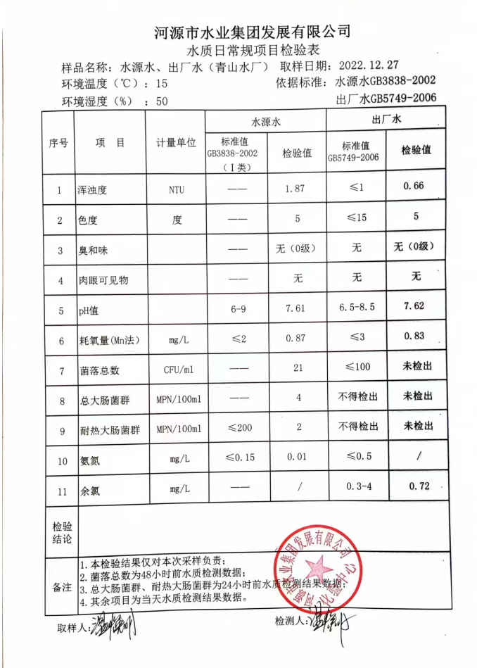 2022年12月27日水質(zhì)檢驗報告