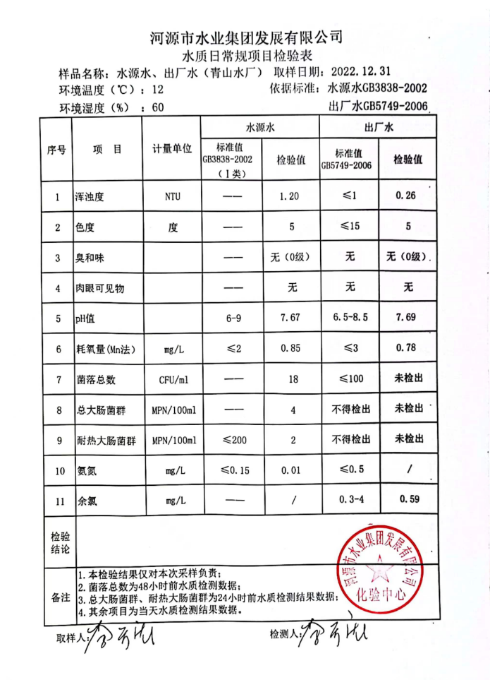 2022年12月31日水質(zhì)檢驗報告
