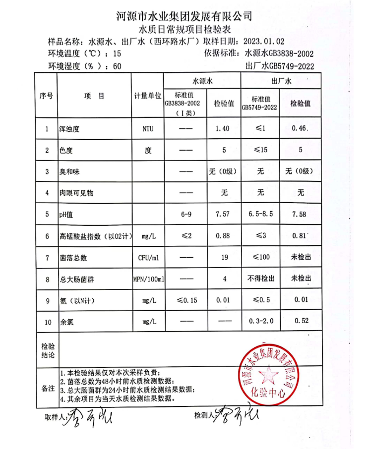 2023年1月2日水質(zhì)檢驗報告