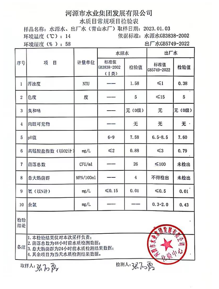 2023年1月3日水質(zhì)檢驗(yàn)報(bào)告