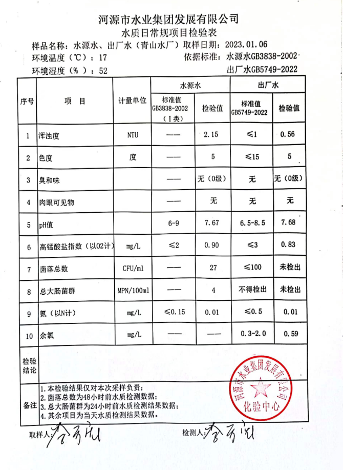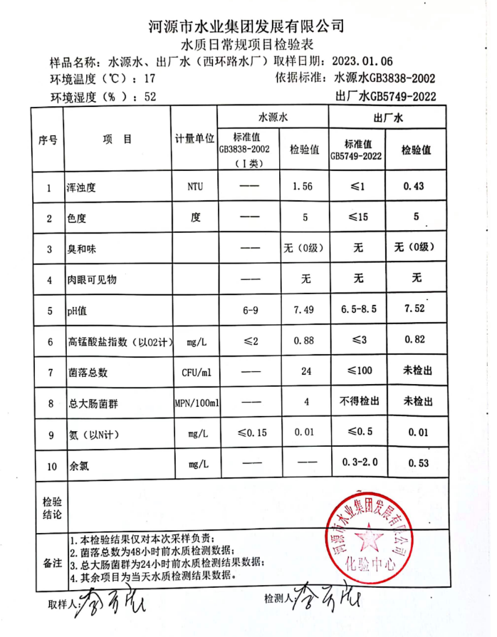 2023年1月6日水質(zhì)檢驗報告