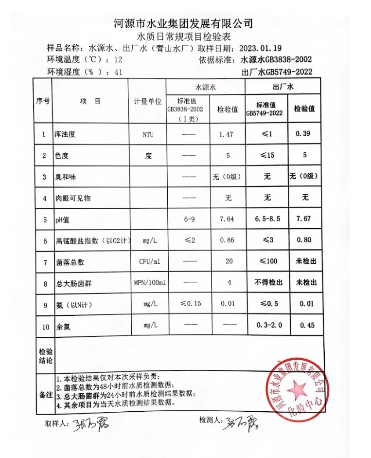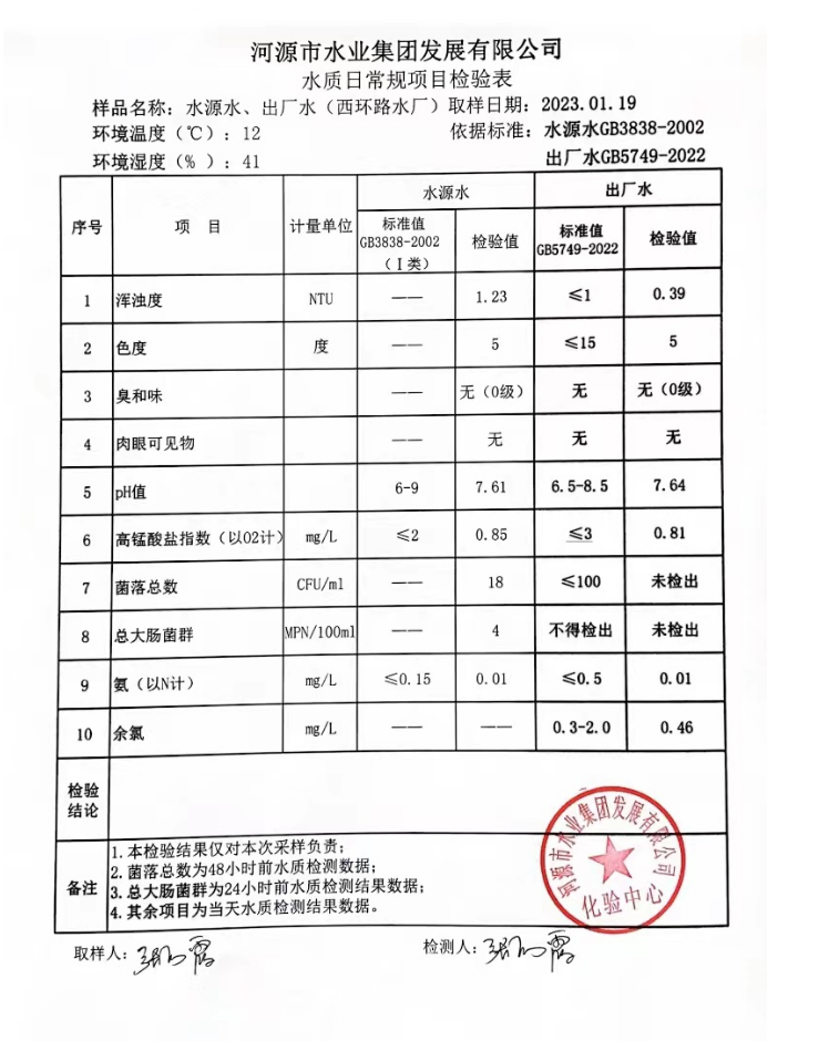 2023年1月19日水質(zhì)檢驗(yàn)報(bào)告