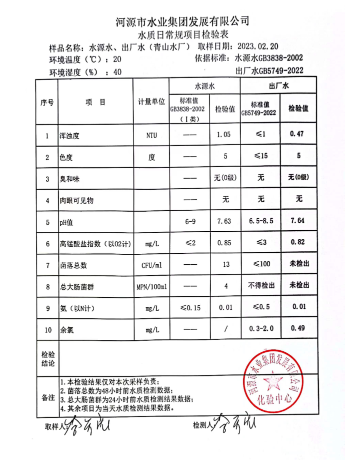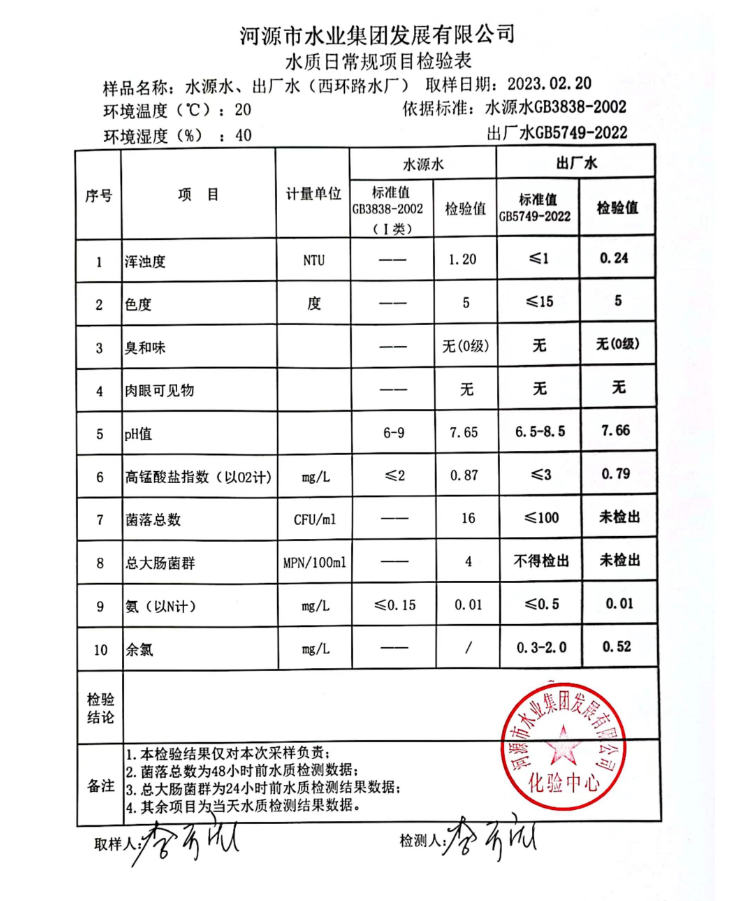 2023年2月20日水質(zhì)檢驗(yàn)報告
