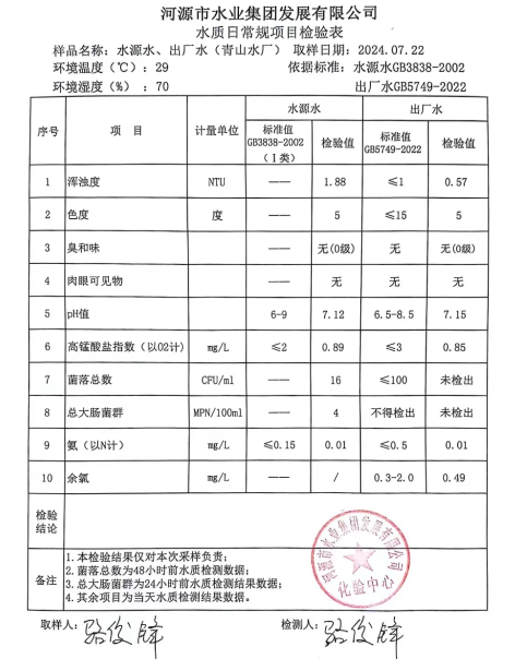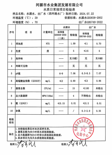 2024年7月22日水質(zhì)檢驗(yàn)報(bào)告